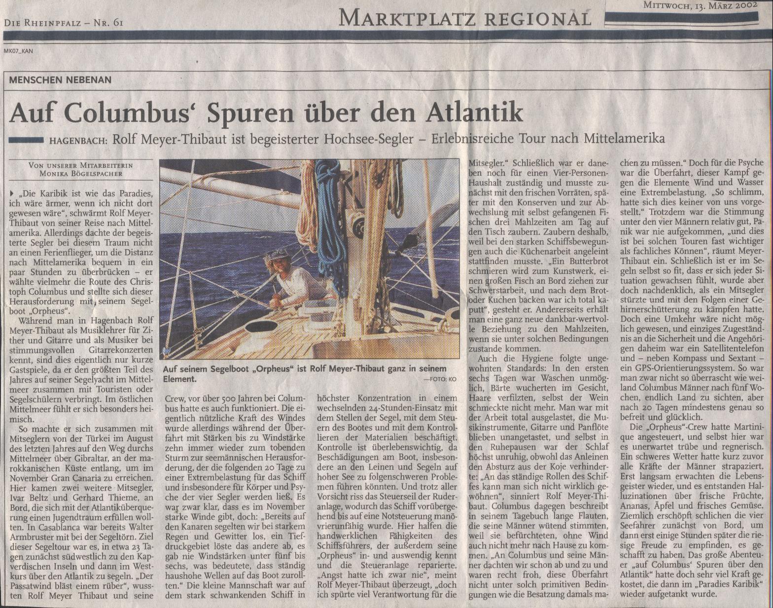 Einen durch Die Rheinpfalz veröffentlichten Reisebericht über eine Atlantiküberquerung können Sie hier einsehen. 2001 auf Hallberg Rassy 41